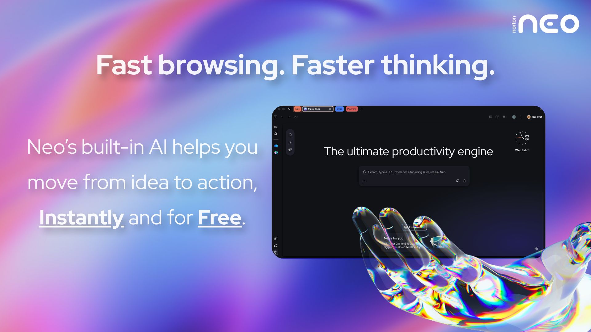 Your browser gets you to a page. Norton Neo gets you to the answer. The first safe AI-native browser built by Norton moves with you from idea to action without slowing you down. Magic Box understands your intent before you finish typing. AI that works inside your flow, not beside it. No prompting. No copy-pasting. No switching apps.