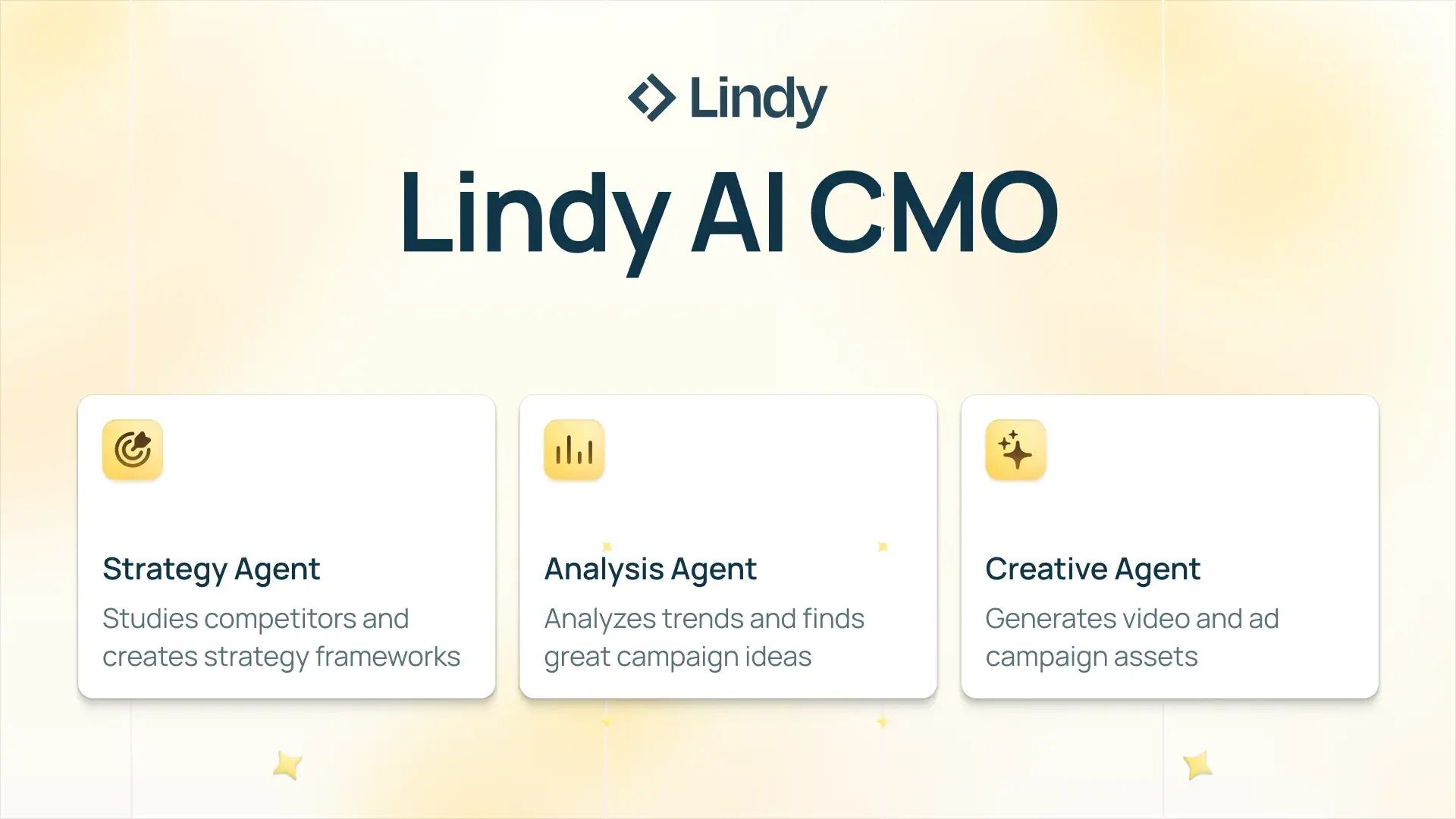 Lindy AI CMO is a suite of powerful agents that ship beautiful marketing campaigns, fast. With Lindy, marketing isn't a grind. It's a system that runs 24/7.
