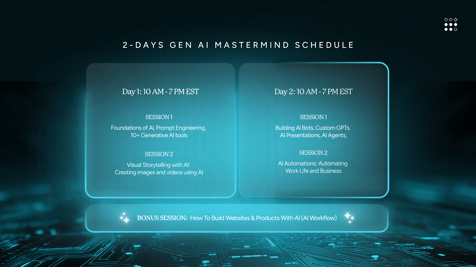 $5100+ worth of AI tools across 2 days — Day 1: 3000+ Prompt Bible, Day 2: $10K/month AI roadmap,post workshop: Personalized automation toolkit.