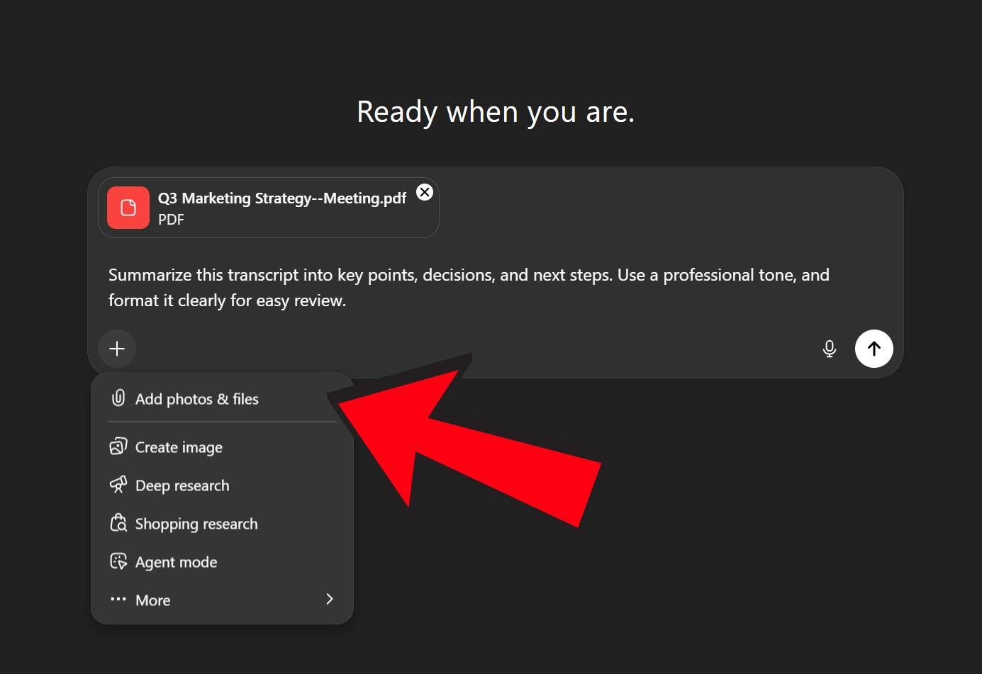 Step 2: Choose “Add photos & files” and upload your transcript file (.txt, .docx, .pdf, etc.).