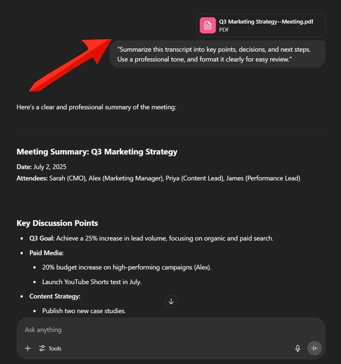 Quick Tip:You can also upload meeting audio (e.g., .mp3, .m4a). ChatGPT summarizes both formats.
