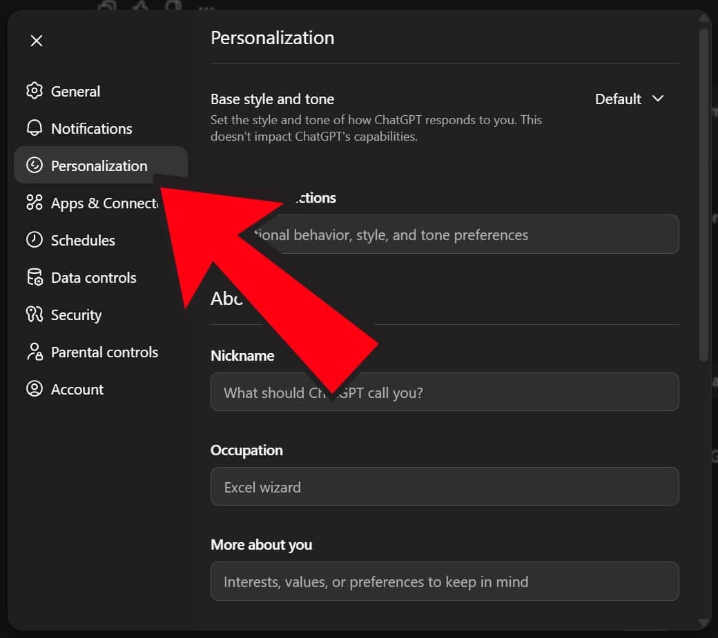 Quick Tip:Use this for content writing, learning, or client work. ChatGPT will instantly adapt to your style and role. Pair with Memory (also in Personalization settings) so ChatGPT remembers specific details about your projects without you adding them to Custom Instructions.