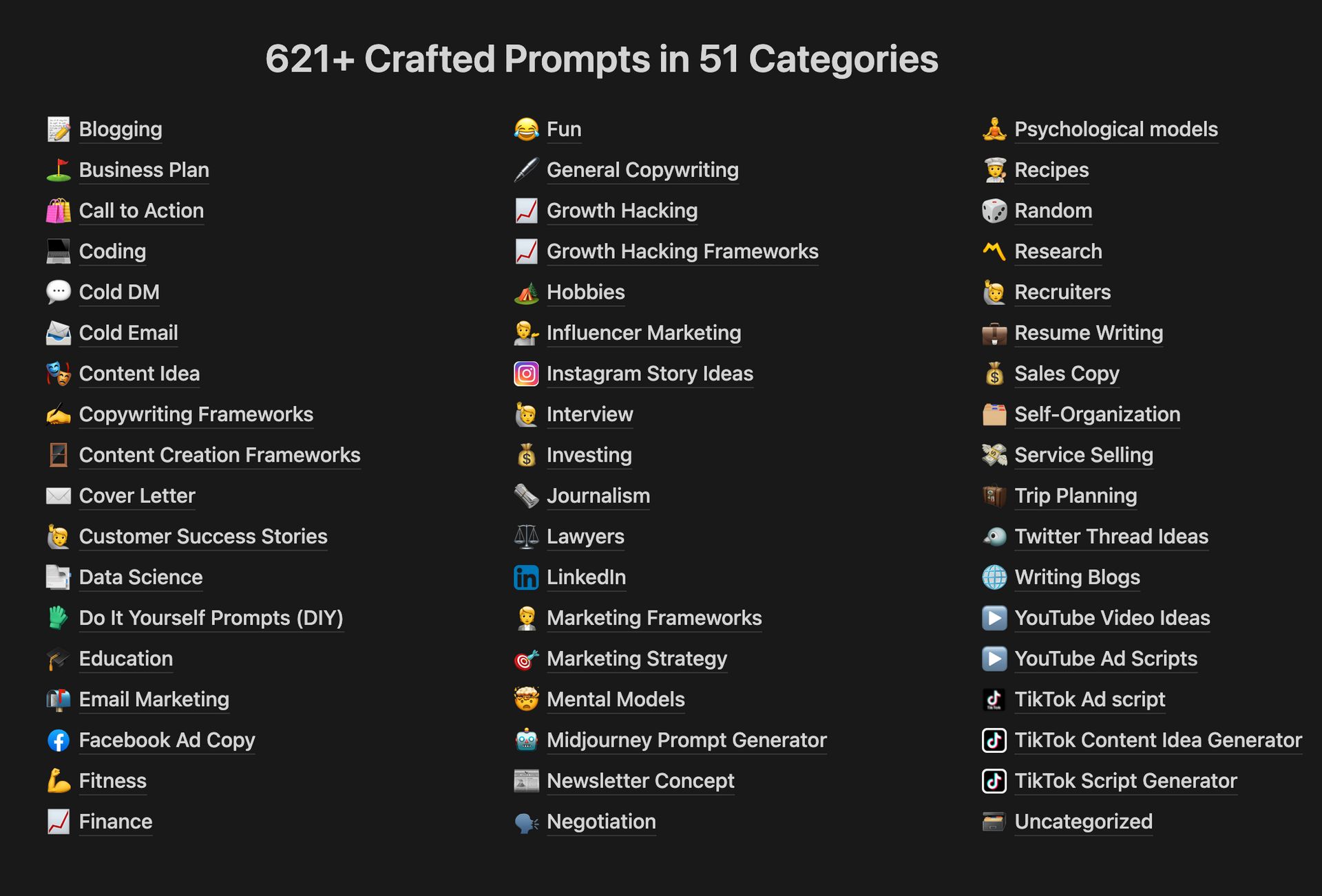 I've spent 2 years collecting over 1027+ useful Prompt Templates in 46 Categories, Tips, Tricks, Hacks, AI tools list, and more!!