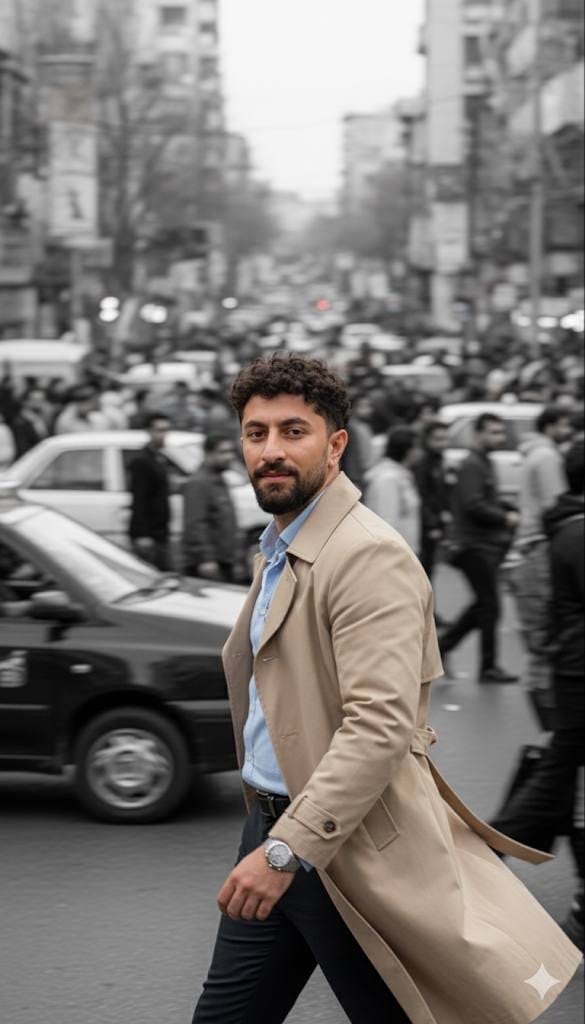 Outfit: • Old Money aesthetic — beige trench coat, blue shirt, dark trousers, classic watch. • Slight movement in the coat or fabric to suggest walking.