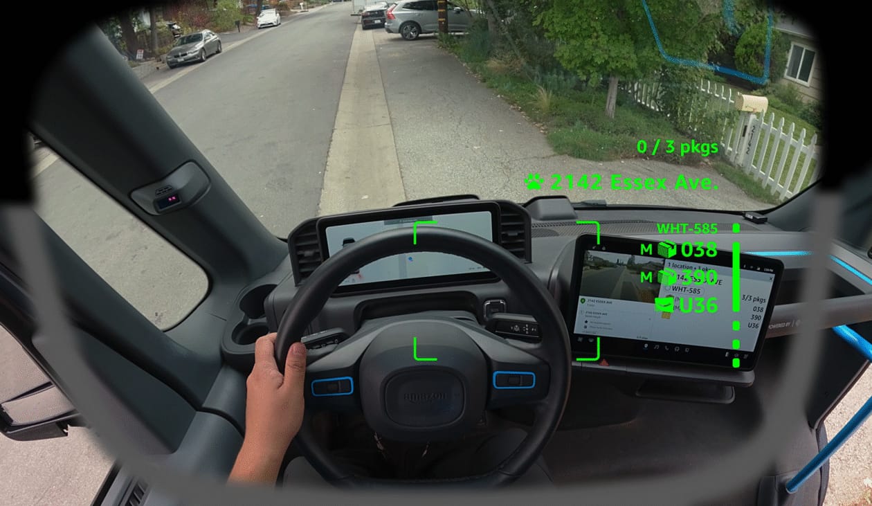 The glasses display turn-by-turn directions, package scans, and delivery confirmations.